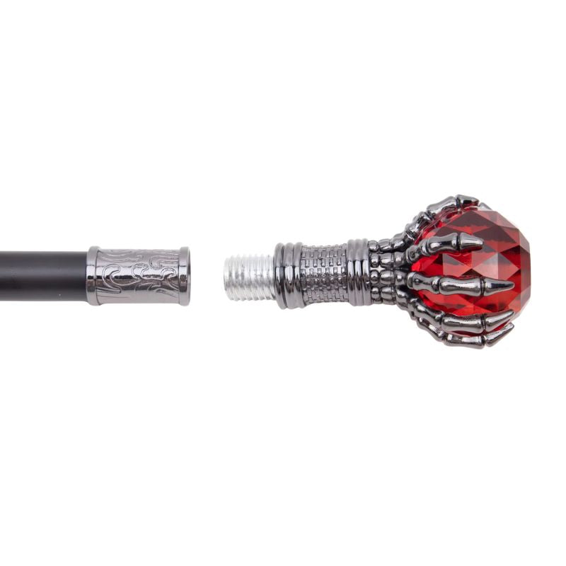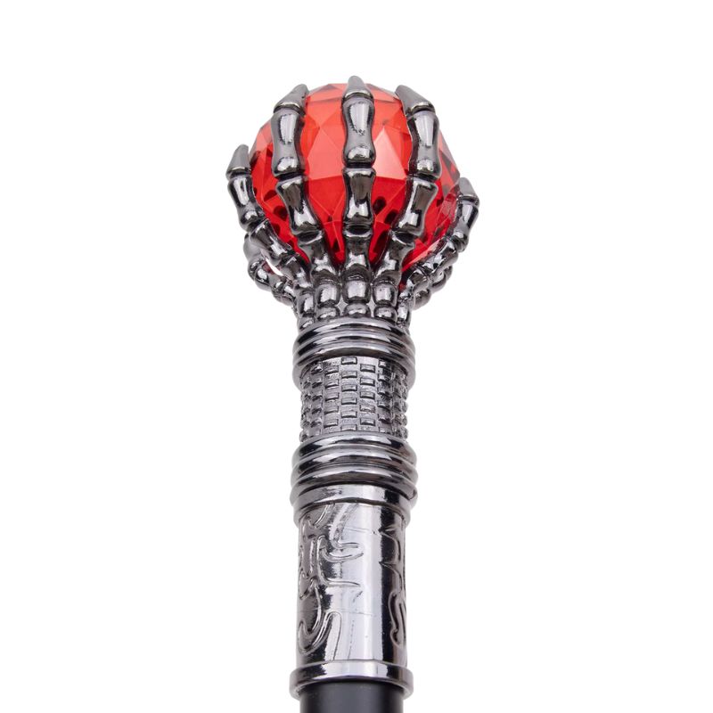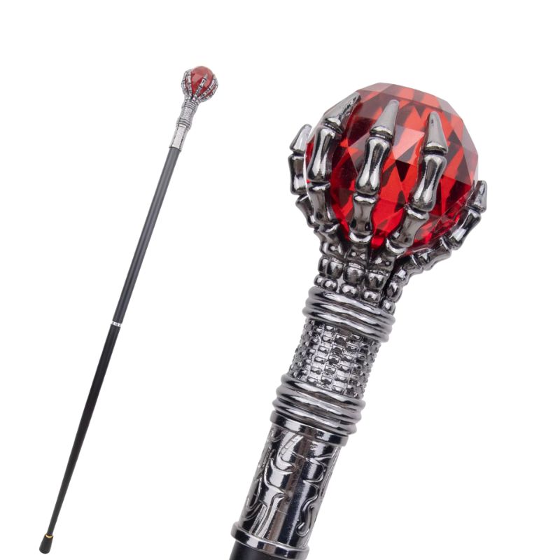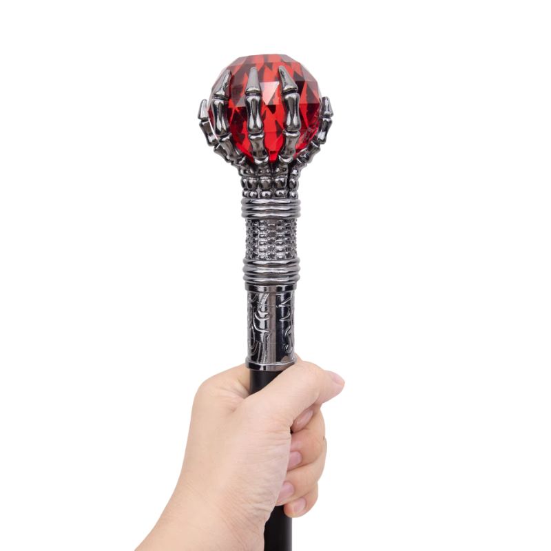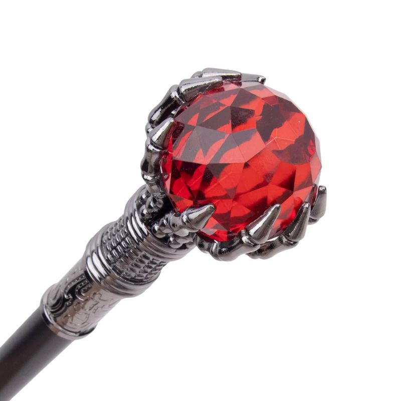 Cette canne pommeau rouge impose sa présence. Avec son pommeau en forme de pierre précieuse écarlate sertie dans une griffe métallique, elle évoque un univers fantastique et théâtral. Un accessoire saisissant, à mi-chemin entre artefact ancien et bijou moderne.