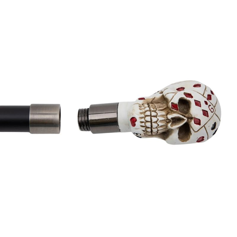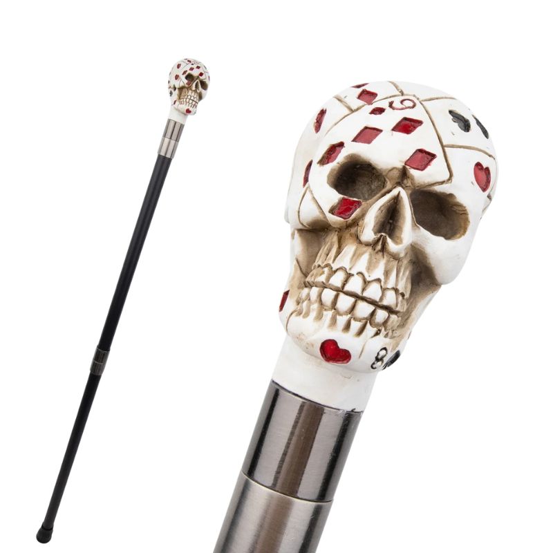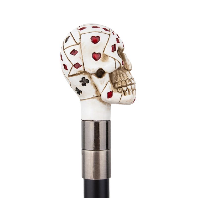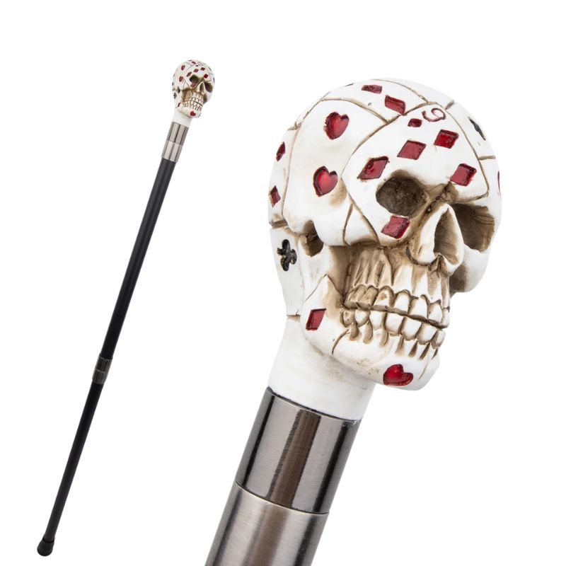 Avec sa tête de mort ornée de cartes à jouer, cette canne affiche une esthétique aussi provocante que soignée. Un symbole fort pour ceux qui aiment l’originalité et l’audace, entre univers gothique et esprit poker.